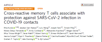 * Cross-reactive memory T cells associate with protection against SARS-CoV-2 infection in COVID-19 contacts. Celulas T con memoria cruzada asociadas con la protección del contagiodel SARS-CoV 2 en contactos de Covid-19.