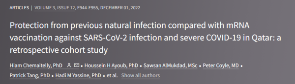 * Protection_from_previous_natural infection compared with mRNA vaccination against SARS- Cov-2: infection and severe COVID-19 in Qatar: a retrospective cohort stud Protección por la infección natural comparada con las vacunas ARNm frente infección por SARS-CoV-2 y Covid severo en Qatar.