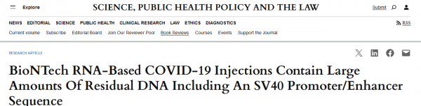 - BioNTech RNA-Based COVID-19 Injections Contain Large Amounts Of Residual DNA Including An SV40 Promoter/Enhancer Sequence. La vacuna BioNTech COVID-19 incluye grandes cantidades de ADN residual incluyendo un Promotor SV40/Secuencia de Estimulo. .