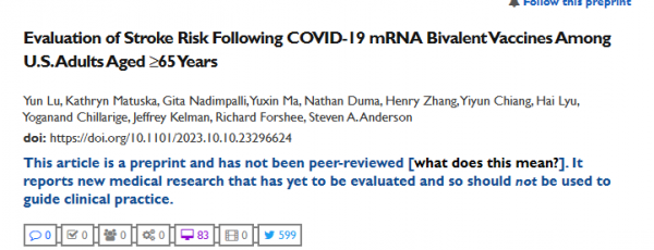 Estudio que encuentra una asociación entre la vacunación bivalente (COVID-19y Gripe) y el accidente cerebrovascular isquémico. Un riesgo que confirmado por historia clínica elevado ( no significativo) en el periodo estudiado 1 a 42 días entre las personas menores de 65 años cuando se coadministran as vacunas bivalentes de Pfizer-BioNTech y contra la influenza el mismo día y entre las personas menores de 65 años que recibieron la vacuna bivalente de Moderna y tenían antecedentes de infección por SARS-CoV-2..Leer mas... .