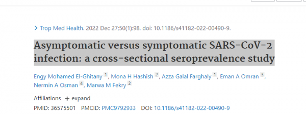 Se estudian los 1434 sujetos con pruebas serológicas positivas (anti-S y/o anti N) de un estudio realizado entre enero y junio de 2021 y que coincidió con la segunda y tercera ola de la pandemia de COVID-19 en Egipto. Los sujetos se clasificaron como sintomáticos o asintomáticos según su historial. Para el diagnostico de Covid sintomático se requería confirmación con las pruebas pertinentes. De los 1434 sujetos 934 (65,1 %) padecieron síntomas mientras y 500 (34,9 %) no los reportaron y se consideraron asintomaticos. Una proporción que se sitúa dentro del rango que se han descrito en los estudios realizados. La proporción de infección sintomática por SARS-CoV-2 se asoció a vivir en barrios marginales, trabajo presencial, la falta de medidas de control de infecciones y de ejercicio regular . Comentario KS:Leer mas...