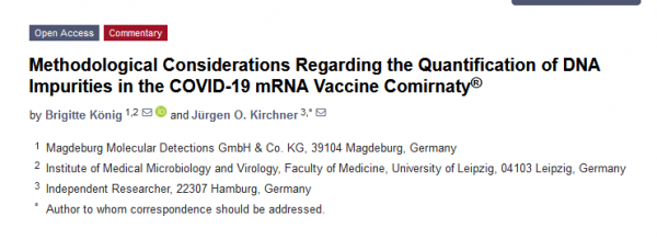 Este trabajo de laboratorio analiza 4 lotes seleccionados al azar de la vacuna covid de ARNm producida por Pfizer para determinar la presencia de ADN. Encuentran cantidades considerables que superan las recomendaciones para medicamentos. La presencia de ADN supone un riesgo evidente ya que vehiculizado por la lipoproteina de la vacuna (y/o por plásmidos derivados de su proceso de producción en el que se utilizan Bacterias) puede entrar a la célula y al núcleo de ésta. Esto significa la posibilidad de interferencia en el funcionamiento celular y de integración en el ADN de las personas que reciben la vacuna.Leer mas... .