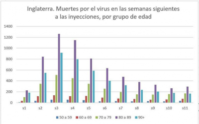 Hoy vuelvo a encontrarme con este fenómeno, ahora escondido en las estadísticas inglesas. La pregunta es: cuántas muertes por el virus se produjeron en las 11 semanas posteriores a cada inyección, clasificadas por el número de semana y la edad. El fenómeno sólo es apreciable en los mayores de 50. Las muertes pican invariablemente en la 3a semana y después caen.